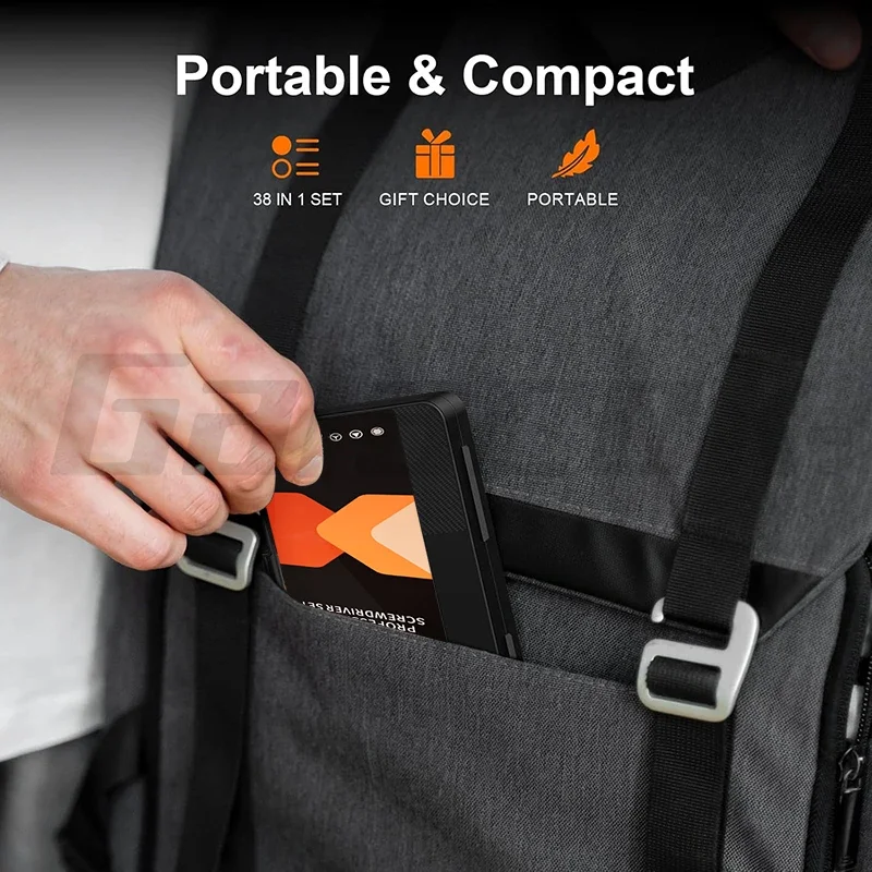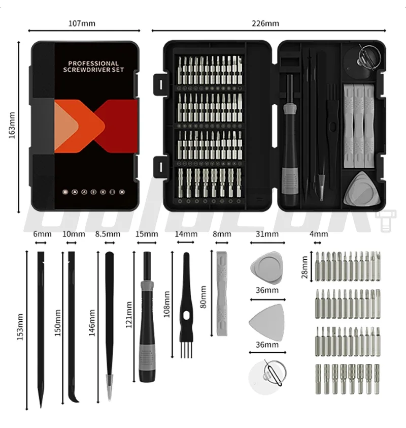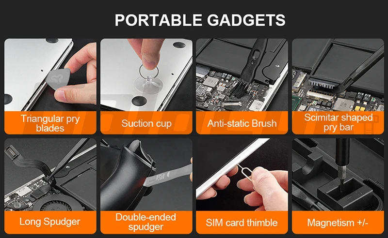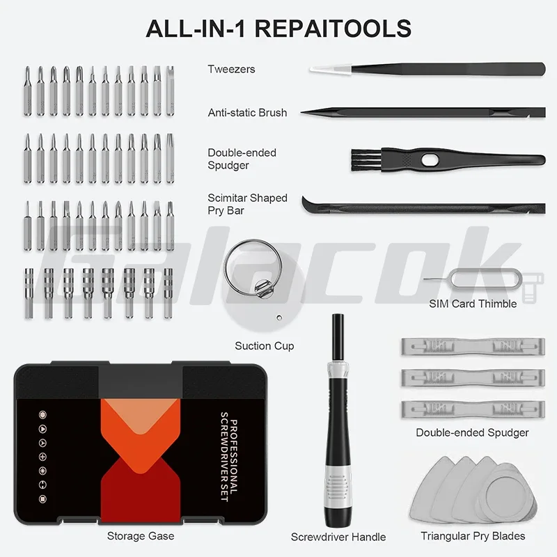 【Multi-Functional Accessories】The kit contains 15 accessories for a variety of repair needs; The set also comes with a magnetic plus or minus area to increase or decrease the magnetism of the drill, a long pry bar, a scimitar shaped pry bar, four triangular pry blades, three double-ended pry bars, tweezers, a black cleaning brush, a SIM card thimble, and a suction cup.
