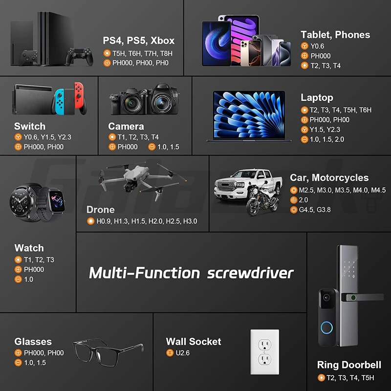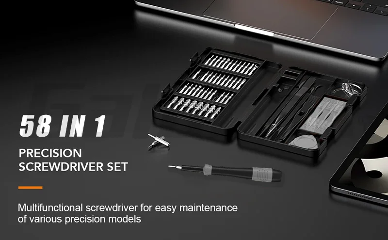 【58 in 1 Precision Screwdriver Set】The screwdriver set contains 44 screwdriver bits, Phillips PH000,PH00,PH0,PH1,PH2; Flathead -1.0, -1.5 -2.0,-3.0; Torx T1 T2 T3 T4 T5, Torx security TR6 TR7 TR8 TR9 TR10 TR15 TR20; Triwing Y0.6, Y1.5. Y2.3, Y3.0; Pentalobe P2(0.8) P5(1.2); Triangle 2.3; U-type U2.6; H-type: H0.9, H1.3, H1.5, H2.0, H2.5, H3.0; MID-type: MID; Sleeve: M2.5, M3.0, M3.5, M4.0, M4.5, Cross 2.0, G3.8, G4.5